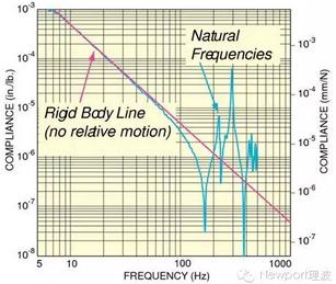 從(cong) 0Hz開始直到數百赫茲(zi) ,順應性向下直線遞減。這一斜率一致的區間亦稱為(wei) 剛體(ti) 線(Rigid Body Line),在該區間內(nei) 桌麵是剛性的,表麵無相對運動。曲線的位置會(hui) 因係統重量改變,但斜率始終取決(jue) 於(yu) 物理性質。圖中每十倍頻率衰減40dB這一斜率由受力加速度和位置改變的關(guan) 係給出。