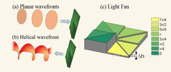 相對論的平麵激光脈衝與“光扇”結構固體靶相互作用,反射出相對論強度的渦旋激光脈衝。後者攜帶有很高的角動量密度,而等離子體也獲得同量反向的軌道角動量。