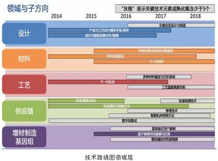 材料。包含3個子方向:“非特定”增材製造技術包,材料性能表征,下一代材料。旨在圍繞增材製造性能表征基準,構建知識體係,消除成品材料性能的波動。材料領域要構建一個範本,以微尺度層麵上對增材製造工藝的物理學控製,代替工藝參數和成品微結構控製,完全按照設計實現一致的、可重複的產品微結構和性能。領域關注點和相關影響分析指標包括:標準化的原材料,基準材料性能數據,“工藝-性能-結構”關係,工藝窗口邊界定義,後處理指南與規範。