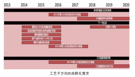 工藝。包含3個子方向:多材料輸送與沉積係統,下一代機床,工藝溫度梯度控製。旨在提升增材製造機床的速度、精度和細節分辨率,並且適應大批量生產,提高成品零件質量。工藝領域要開發“機床級”工藝性能提升所需的關鍵技術和相關子係統,類似於柔性製造係統。領域關注點和相關影響分析指標包括:製造速度,精度,細節製造能力,表麵質量,最大零件尺寸。
