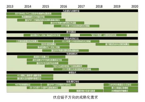 價值鏈。包含6個子方向:先進感知與探測手段,數字線集成,智能機床控製方法,快速檢測技術,修理技術,標準/模式/協議。旨在逐漸降低端到端價值鏈成本,縮短增材製造產品的上市時間。價值鏈領域要開發快速合格鑒定/認證方法,以及從全盤角度,在整個產品壽命周期中集成相關技術,包括材料和產品可回收性。這一領域已經在國防部ManTech計劃先進製造企業(AME)投資科目中被確認為構建單一集成數字線的首要關注點,可以幫助確認所需的工人技能和使能手段,以及凸顯麵向快速設計與檢測的新技術需求,比如提高生產率的設計輔助手段和計算機程序。領域關注點和相關影響分析指標包括:工藝成本,原材料成本,質量控製成本,工人生產率成本,能量效率成本。