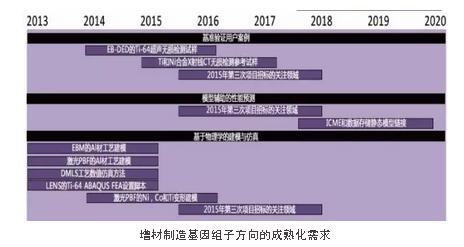 增材製造基因組。包含3個子方向:基準驗證用戶案例,模型輔助的性能預測,基於物理學的建模與仿真。旨在逐漸減少增材製造新材料設計、開發與合格鑒定所需的成本和時間。基因組領域要開發新的計算方法,比如基於物理學的和模型輔助的材料性能預測工具;開發驗證計算預測方法所需的基準數據集;針對增材製造的每個新材料-工藝組合,開發材料性能表征的新概念,打破設計容許值的傳統開發路線。領域關注點和相關影響分析指標與美國國家材料基因組計劃相似,包括:計算機輔助材料開發,模塊化開放式仿真架構,訪問透明化的材料性能數據,多尺度數據管理和共享,高效的材料性能表征方法。