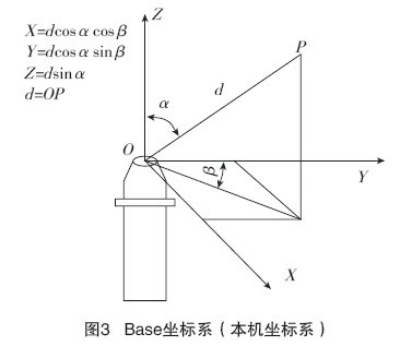 激光跟蹤儀得到的測量數據定義了一個完整的球體坐標係。原點是主機反射鏡中心,根據三角函數公式可將球坐標係下的坐標值轉換成笛卡爾坐標係下的坐標值,坐標係原點仍在反射鏡中心,稱作base或本機坐標係,被固化在硬盤中,不能被執行刪除、更名等操作。base坐標係也是開始一個新工作的起始坐標係,如圖3所示。