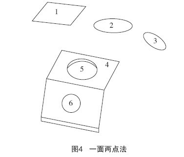 一麵兩點法即用一個平麵和兩個點創建一個坐標係。實際點和理論點可以是:點、圓、球、方、圓環或橢圓元素。為計算坐標係,第一個點和第二個點不能是一個點,也不能在垂直於平麵的一條直線上。如圖4所示,麵1為理論平麵,點2和點3為理論點,麵4為實際平麵,點5和點6為實際點。其原理是調節每一個元素的理論值達到測量值,麵將固定2個旋轉自由度和一個平移自由度,第一個點固定2個平移自由度,第二個點固定一個旋轉自由度。