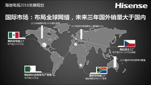 在國際市場,海信將加快布局全球網絡,並提升全球品牌運營能力,未來三年,海信的目標是要做到國外市場銷量大於國內市場。 2015年,海信海外產業布局進一步擴張。在美洲,海信成功收購夏普墨西哥電視工廠及其電視業務;在歐洲,海信捷克工廠順利投產;在南非,海信南非工廠完成了擴建改造;在阿爾及利亞興建了電視生產基地。海信全球生產布局已初具規模。海外市場表現方麵,2015年,海信電視自有品牌在美國市場獲得了100%的增長速度,澳洲市場份額增長幾近翻番,歐洲市場品牌收入增長30%以上,南非市場銷量位居前兩位。