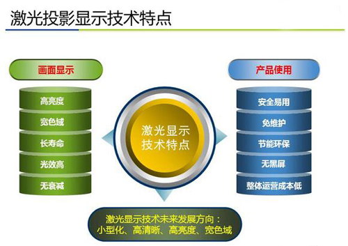 激光投影顯示技術也稱激光顯示技術,能實現傳統顯示所達到的所有先進技術指標,如大屏幕、高分辨率、數字化等,以激光作為光源,具有波長可選擇性和高光譜亮度等特性,擁有更廣的色域,是CRT的兩倍。它與目前主流的光反射式投影技術有著本質的區別,其不需要通過透鏡成像,因此沒有了焦距問題,此外,由於它沒有任何內部的移動部件,也無需散熱設計,所以,激光投影產品的設計十分緊湊,體積非常小巧,是深受越來越多消費者青睞的一種產品。目前所涉及的產品涵蓋激光電影機、激光投影機、激光電視、激光背投拚接牆、激光微型投影、激光投影手機、激光三維立體顯示機等等,可見涉及的產品已十分豐富。在各領域的應用也十分廣闊,包括互動遊戲、體感交互、激光電視、廣告櫥窗、玻璃物聯網、智能商教、室內互動大屏、舞台奇幻等在內的激光投影應用新領域。