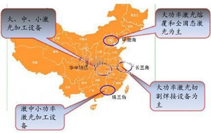 我國激光企業具有群體聚集性,主要分布在五個產業帶:珠三角、長三角、華中、環渤海地區,以及新興的東北工業振興區。另外,西部產業帶也將成形。其中,特別值得一提的是東北工業區,不少激光企業發展勢頭良好。這五個產業帶側重點不同,珠三角以中小功率激光加工機為主,長三角以大功率激光切割焊接設備為主,環渤海以大功率激光熔覆和全固態激光為主,以武漢為首的華中地區則覆蓋了大、中、小激光加工設備。