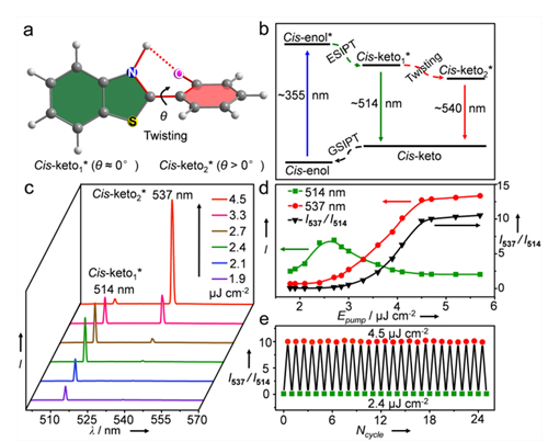 圖1. 基於激發態分子內質子轉移過程的波長可切換有機微納激光
