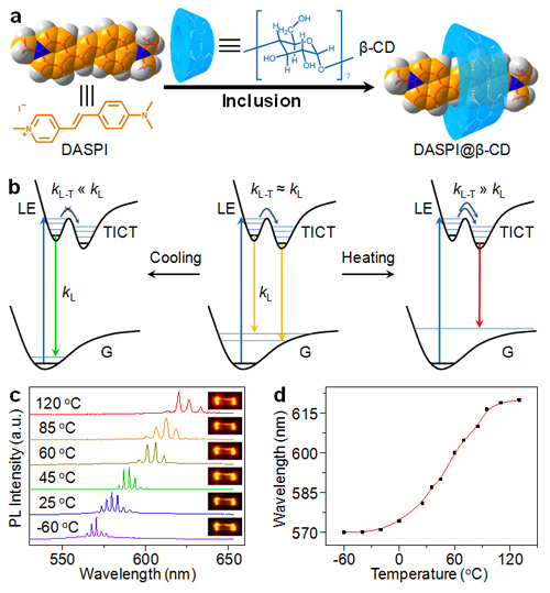 進一步,研究人員選擇具有分子內電荷轉移(ICT)特性的化合物作為增益材料來構築有機微納激光。這類化合物具有兩個上能級,而且能級結構和激發態過程對不同的環境有特定的響應。首先通過超分子限域體係設計,實現了兩個上能級布居數的控製。進一步通過穩態與瞬態光譜分析,提出了基於兩個上能態協同增益的全新的激光產生機製,這種機製提供了一種通過控製兩個上能態間的粒子數分布來調控增益區間的新思路。基於此,通過實時改變環境溫度來控製分子內電荷轉移過程,有效地調控了有機超分子微晶的增益區間,進而實現了發射區間連續可調的寬譜微型激光器(圖2)。相關研究成果發表於《美國化學會誌》(J. Am. Chem. Soc. 2016, 138, 1118-1121)。