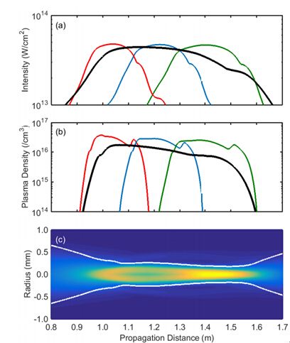 圖 (a)多焦距光束的峰值強度 (b)等離子體濃度及光通量 (c)在傳輸過程中的變化情況