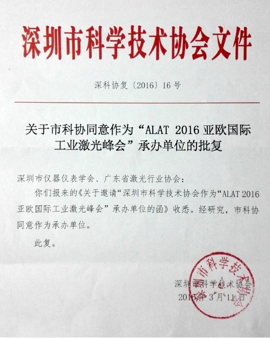 近日,廣東(dong) 省激光行業(ye) 協會(hui) 收到深圳市科學技術協會(hui) 批複:同意作為(wei) 2016年亞(ya) 歐國際工業(ye) 激光峰會(hui) 的承辦單位。相信深圳市科協的加入承辦,將讓本屆亞(ya) 歐國際工業(ye) 激光峰會(hui) 更具影響力與(yu) 權威性。