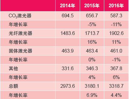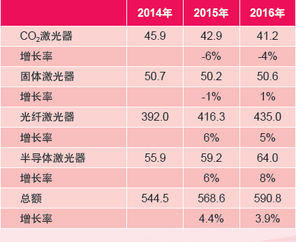 表1:工業(ye) 激光器市場的銷售收入(貨幣單位:百萬(wan) 美元)