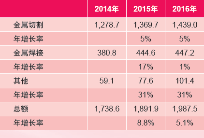 在表2中,材料加工市場的優(you) 勢非常明顯,有59%的總銷售收入要歸功於(yu) 用於(yu) 材料加工的平均功率大於(yu) 1kW的激光器。這個(ge) 應用領域繼續以每年9%的速度在增長。微加工(占總銷售收入的23%)主要是使用功率小於(yu) 1 kW的激光器,繼續以4%的速度在增長。打標/雕刻類別(占18%)——工業(ye) 激光市場中唯一的“消費產(chan) 品”領域,其增長非常穩定,雖然並不那麽(me) 引人注目(4%)。2015年,三個(ge) 加工類別都在增長。從(cong) 業(ye) 內(nei) 的預測來看,2016年很有可能繼續重演2015年的表現,上半年溫和增長,下半年將會(hui) 更好。