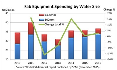 在2015年11月發布的全球晶圓廠商的季度預測中,SEMI表示芯片製造商的產能支出僅增長0.5個百分點,達到358億美元。