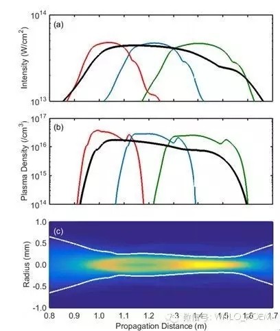 圖 (a)多焦距光束的峰值強度 (b)等離子體濃度及光通量 (c)在傳輸過程中的變化情況