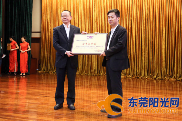 在廣東省激光產業技術創新聯盟成立儀式上,廣東省科技廳副廳長葉景圖為該聯盟理事長單位授牌。