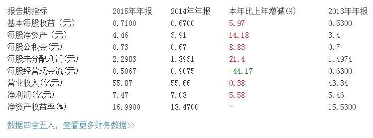 2015年度營業收入558,734.47萬元,營業利潤61,442.31萬元,歸屬於母公司的淨利潤74,695.15萬元,扣除非經常性損益後淨利潤67,052.79萬元,分別較上年度增減幅度為0.39%、-7.45%、5.57%、4.57%。
