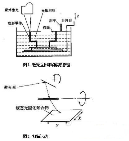其成型設備又稱“立體平版印刷設備”,是最早出現的一種商品化的快速成形機,它由液槽、可 升降工作台、激光器、掃描係統和計算機控 製係統等組成。其中,液槽中盛滿液態光敏 聚合物(通常20~200L)。帶有許多小孔洞 的可升降工作台在步進電機的驅動下能沿 高度Z方向作往複運動。激光器為紫外(UV)激光器,如氦鎘(He-Cd)激光器、氬離子(Ar)激光器和固態激光器,其功率一般為10至200mW,波長為320至370um(處在中紫外至近紫外波段)。掃描係統為一組定位鏡,它能根據控製係統的指令,按照每一截麵輪廓的要求作高速往複擺動,從而使激光器發出的激光束反射並聚焦於液槽中液態光敏聚合物的上表麵,並沿此麵作X-Y方向的掃描運動(如圖2所示)。在這一層受到紫外激光束照射的部位,液態光敏聚合物快速固化,形成相應的一層固態截麵輪廓。 SLA成形時,激光束按數控指令掃描,可升降工作台的上表麵處於液麵下一個截麵層厚的高度(通常為0.125至0.75mm),該層液態光敏聚合物被激光束掃描發生聚合反應而固化,並形成所需第一層固態截麵輪廓後,工作台下降一層高度,液槽中的液態光敏聚合物流過已固化的截麵輪廓層,刮刀按照設定的層高作往複運動,刮去多餘的聚合物,再對新鋪上的這一層液態聚合物進行掃描固化,形成第二層所需固態截麵輪廓,新固化的一層能牢固的黏結在前一層上,如此重複直到整個製作成形完畢,得到一個三維實體原型。