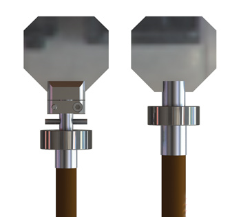 傳統的振鏡具有一個直徑比磁鐵小得多的輸出軸。製造商常常在這個非常小的軸上鑽一個孔,在其中放置一個“停止銷”(stoppingpin)來限製電機的旋轉量。不幸的是,這意味著,這個軸必須做得更長以容納停止銷,這個用來容納停止銷的孔會削弱軸的強度。然後一個獨立的鏡座被用來作為軸和鏡子之間的界麵,從而增加了磁鐵和鏡子之間的距離。