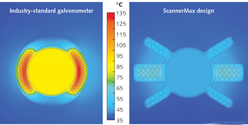 圖3.在熱方麵不堪重負的傳統的振鏡電機(左)與在提供的扭矩下運行溫度更低的ScannerMAX Saturn電機(右)的比較。