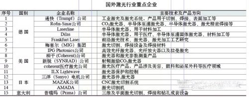 以德國、美國、日本、俄羅斯為代表的少數發達國家,目前主導和控製著全球激光技術和產業的發展方向(見附表)。其中,德國Trumpf、Rofin-Sinar公司在高功率工業激光器上稱雄天下;美國IPG公司的光纖激光器引領世界激光產業發展方向。歐美主要國家在大型製造產業,如機械、汽車、航空、造船、電子等行業中,基本完成了用激光加工工藝對傳統工藝的更新換代,進入“光加工”時代。