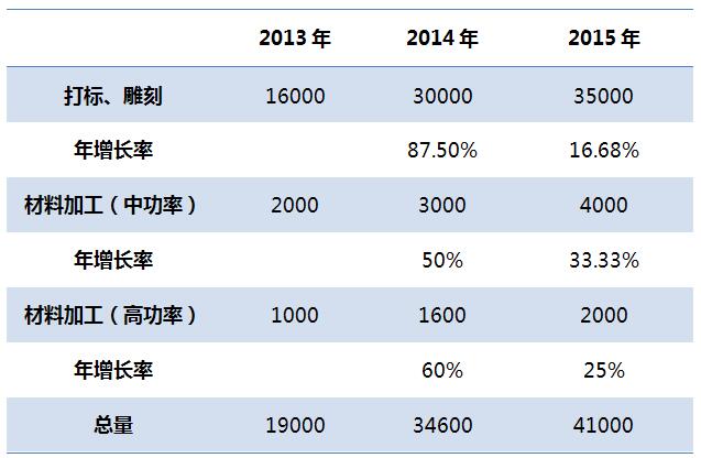 近三年國內光纖激光器市場總量數據顯示,打標、雕刻仍是主要市場容量的承載部分,構成光纖市場80%以上的產量值。2013-2014年,光纖激光器以激光打標市場為突破口迎來井噴之年,2013年-2014年期間產量由1.9萬台迅速增長至近3.5萬台。隨著中高功率光纖激光器市場需求增長,光纖激光製造商都在往中高功率延伸,2015年光纖激光器在各應用領域保持穩步增長,整體產量突破4萬。