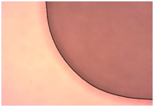 上圖為(wei) 玻璃在400倍顯微鏡下的切割工藝圖,崩邊尺寸小於(yu) 3微米,側(ce) 壁光滑。