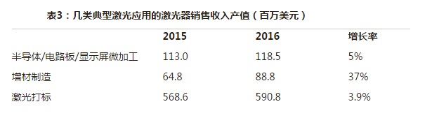 表3:幾類典型激光應用的激光器銷售收入產值(百萬美元)