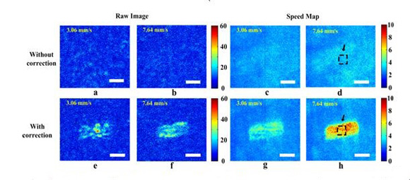 圖. 2運動物體(ti) 透過擴散片後在波前矯正前後的原始圖和流速圖比較結果