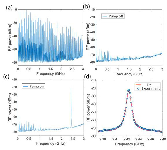 圖 (a) 多縱模激光注入波導前測得的拍頻信號;(b) 多縱模激光注入波導後測得的拍頻信號(沒有泵浦光);(c) 多縱模激光注入波導後測得的拍頻信號(有泵浦光);(d) 泵浦光和Stokes光的拍頻信號。