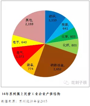 蘇州民營工業(ye) 企業(ye) 多布局於(yu) 紡織、服裝、鋼鐵、冶金、化學等傳(chuan) 統部門,以沙鋼、恒力、亨通為(wei) 代表。08年金融危機後,外需萎縮、國內(nei) 通脹,紡織、服裝等勞動密集型部門受重創。