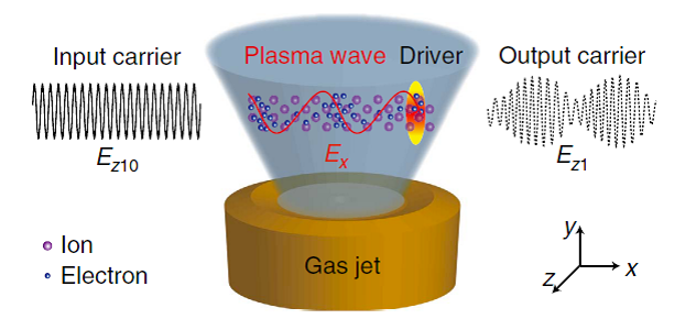 研究團隊先用一束具有弱相對論光強的超短飛秒激光脈衝(chong) 在亞(ya) 毫米尺度的稀薄氣體(ti) 中激發起一種電子等離子體(ti) 波(類似於(yu) 船在水中航行時留下的尾跡)。該等離子體(ti) 波跟隨激光脈衝(chong) 以接近真空中光速的相速度傳(chuan) 播,其特征振蕩頻率在THz量級。當另外一束有一定時間延遲的、同向傳(chuan) 播的皮秒信號脈衝(chong) 傳(chuan) 輸到等離子體(ti) 波區域時,它的振幅和頻率能夠快速地被等離子體(ti) 波同時調製,產(chan) 生具有非常大的頻譜帶寬脈衝(chong) 列,其低頻部分甚至能延伸至中紅外波段。這種等離子體(ti) 調製器能夠承受的激光脈衝(chong) 強度可比傳(chuan) 統的弱光調製器的光強閾值高十幾個(ge) 數量級,調製速度快1-2個(ge) 數量級。由於(yu) 實現等離子體(ti) 調製器所需的激光條件已經可以通過商品化激光器獲得,它有望成為(wei) 一種新型的等離子體(ti) 光子器件,在強THz輻射產(chan) 生、超亮X射線產(chan) 生和激光聚變領域獲得應用。