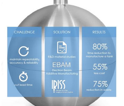 洛克希德·馬丁公司董事長、總裁兼CEO Marilyn A. Hewson最近在航天工業協會(AIA)供應商管理委員會夏季會議上談到了這一成功合作。她說:“當我們的太空係統商務部門想要尋找方法,在保持衛星部件質量的基礎上降低成本時,一家名為Sciaky的公司給我們提供了一種解決方案。我們共同開發可以通過電子束增材製造工藝進行3D打印的鈦推進劑貯箱。”
