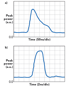 圖3:IPG推出的脈衝(chong) 長度為(wei) 100 ns(a)的固定脈衝(chong) 光纖激光器以及另一款脈衝(chong) 長度為(wei) 4ns(b)的MOPA光纖激光器短暫的脈衝(chong) 形狀。