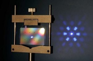 掃描光纖產生的圖像下一步將送到“光子光場芯片”。它是整個Magic Leap的技術核心,也難怪公司創始人在接受《連線》采訪時也驕傲地展示了這個類似玻璃眼鏡片的東西。對物理知識略有了解的人都能猜出這塊“鏡片”可能是一種極為特殊的衍射光柵。