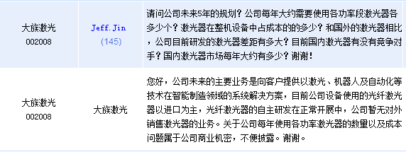 大族激光(002008)周二在全景網互動平台上表示,公司未來的主要業(ye) 務是向客戶提供以激光、機器人及自動化等技術在智能製造領域的係統解決(jue) 方案,目前公司設備使用的光纖...
