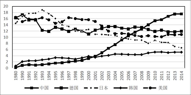 1980-2014年主要國家裝備製造業出口規模。資料來源:機械工業信息研究院