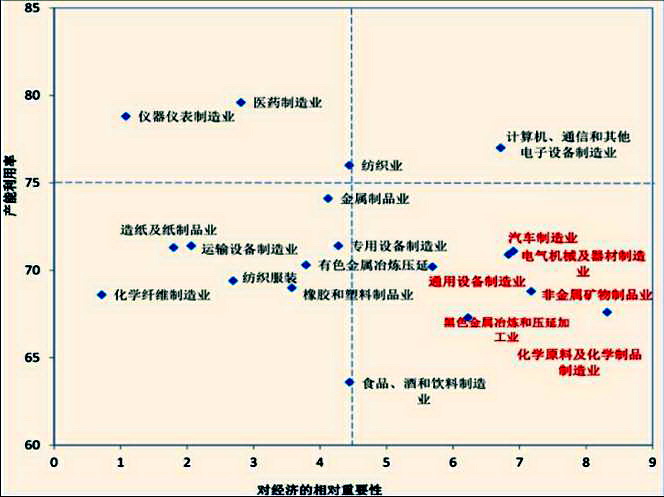 製造業各部門產能利用率和對經濟的重要性(橫軸是表示各行業占製造業百分比)。資料來源:機械工業信息研究院