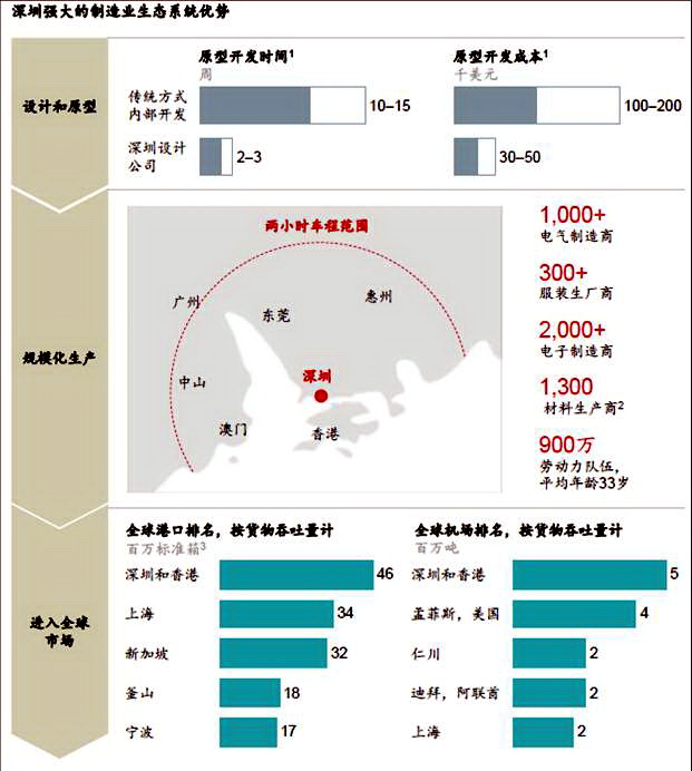 生態係統較為完善,具有成本、市場響應速度、服務等比較優勢。如在深圳的兩個小時車程範圍內,擁有1000多家電氣製造商、300多家服裝製造商、2000多家電子製造商、1300多家材料製造商,近1000萬名勞動力,數量級的優勢和完善的生態係統,使得深圳的手機製造商在製造普通的功能手機的原型開發成本降低1/6-1/4,原型開發時間降低1/7-1/5。
