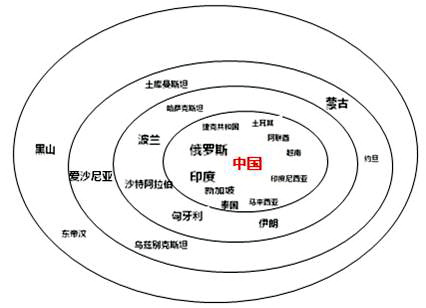 有人將一帶一路畫成兩條曲線,有人則將一帶一路畫成兩個同心圓圈,叫做一帶一路上的“朋友圈”。