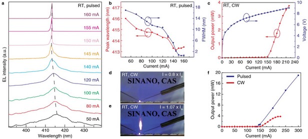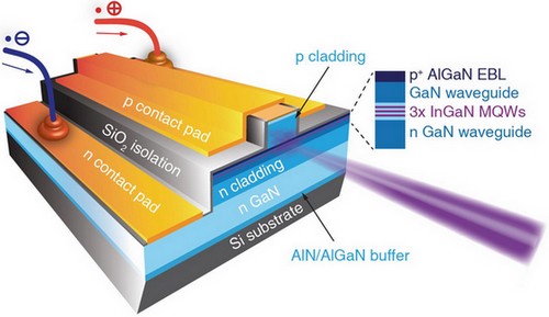 針對這一關鍵科學技術問題,中科院蘇州納米所楊輝研究員領導的III族氮化物半導體材料與器件研究團隊,采用AlN/AlGaN緩衝層結構,有效降低位錯密度的同時,成功抑製了因矽與GaN材料之間熱膨脹係數失配而常常引起的裂紋,在矽襯底上成功生長了厚度達到6 μm左右的InGaN基激光器結構,位錯密度小於6×108 cm-2,並通過器件工藝,成功實現了世界上首個室溫連續電注入條件下激射的矽襯底InGaN基激光器,激射波長為413 nm,閾值電流密度為4.7 kA/cm2。