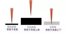 那麽,什麽叫焦點控製呢?熟悉激光切割機的朋友都知道,激光切割機在切割不同材料以及不同厚度的板材時,為了達到更好的切割效果,激光束的焦點都會設置在不同的地方(如圖),即稱為我們所說的調焦。