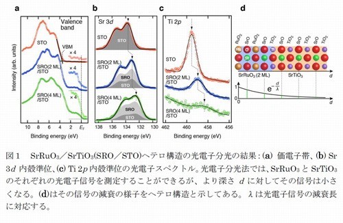 利用兵庫縣的大型同步輻射設施“SPring-8”的高亮度軟X射線束,測量光電子能譜(對金屬和半導體(ti) 照射光,根據釋放的電子能量得知固體(ti) 表麵電子結構的實驗方法)發現,因SrRuO3的膜厚不同,SrRuO3膜的電子狀態會(hui) 由半導體(ti) 變為(wei) 金屬,隨之,SrTiO3基板的載流子電子密度會(hui) 由高變低。