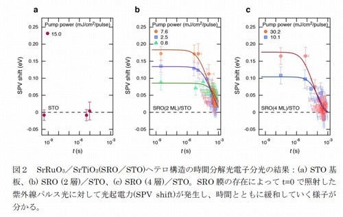 具體(ti) 來說就是,SrRuO3的膜厚變化時,異質界麵的電子結構會(hui) 劇烈變化,其相應的光學響應會(hui) 提高200倍等,且光電動勢的大小和緩和壽命會(hui) 敏感地變動。