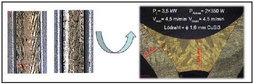 為了更直觀地評估三光點釺焊的優勢,我們用1.6 mm的CuSi3合金焊絲、3.5 kW的光纖激光釺焊主光束,以4.5 m/min的速度對厚度為0.8 mm的熱浸鋼板樣件進行釺焊。在采用350 W引導光束在釺焊前對材料進行預清理以後,更好的邊緣一致性和表麵光潔度明顯可見(如圖3)。