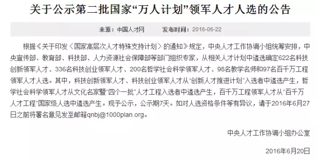 萬人計劃”又稱“國家高層次人才特殊支持計劃”,2012年經黨中央、國務院批準,中央組織部、人力資源社會保障部等11個部委聯合組織實施的國內高層次人才支持計劃。 “萬人計劃”定位高端人才,入選者均代表國家科技創新重點領域、行業學科一流水平的高層次人才。“萬人計劃”將用10年時間重點遴選國內傑出人才、領軍人才、青年拔尖人才10000名。