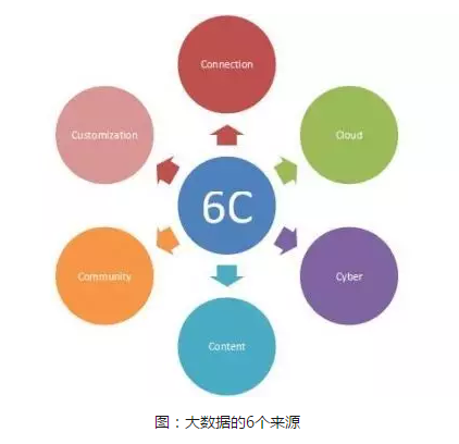 就製造產業來看,大數據主要來源於六個方麵,被稱為“6C”:Connection(連接:傳感器和網絡)、Cloud(雲:任何時間及需求的數據)、Cyber(虛擬網絡:模式與記憶)、Content(內容:相關性和含義)、Community(社群:分享和交際)、Customization(客製化:個性化服務與價值)。