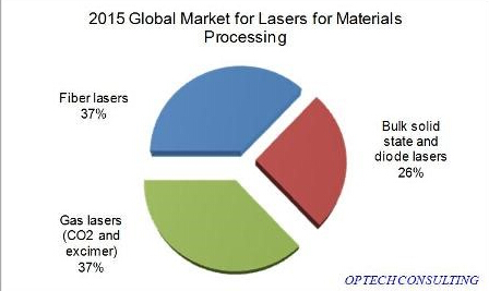 2015年,光纖激光器占全球激光材料加工37%的市場份額(32億(yi) 美元);另外,氣體(ti) 激光器占37%,大容量固體(ti) 、半導體(ti) 激光器占據26%。產(chan) 品在過去10年所占市場份額大幅增加,從(cong) 2005年的4%增長到2010年的14%,直到2015年的37%。過去五年光纖激光器材料加工市場的平均年增長率始終接近30%。