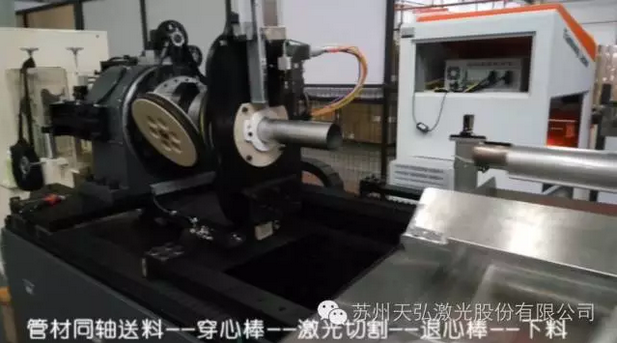 在製管機連續輸出無限長不鏽鋼管的生產(chan) 線上,天弘激光在線分管機可實現在線自動切割成短管產(chan) 品的分管功能。在此環節中,管材通過製管線連續成品管材輸出,同軸的防飛濺擋渣機構自動接入管內(nei) ,切割頭伴隨旋切模組完成旋切,擋渣機構自動回縮,管材滑落在落料平台上,輸出進入下個(ge) 流程。