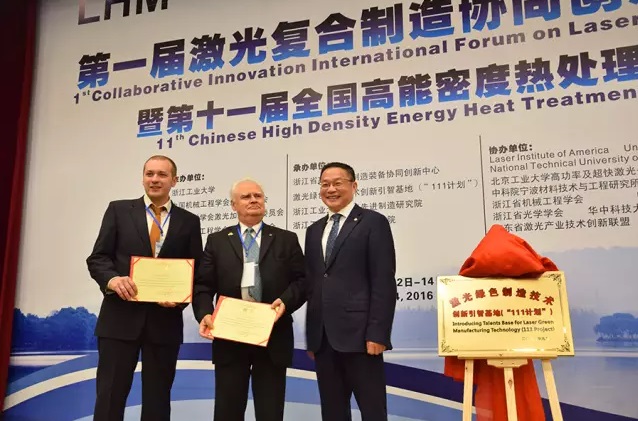 梅新林在致辭中代表浙江工業大學對會議的召開表示衷心的祝賀,向蒞臨本次大會的各位領導、專家和企業家們表示衷心的感謝,他還向與會代表介紹了我校近年來的發展情況和教學、科研、社會服務方麵取得的各項成果。之後,梅新林書記與厲勇局長共同為浙江工業大學“激光綠色製造技術創新引智基地”(簡稱“111計劃”)揭牌,並為英國皇家工程院院士、美國激光學會主席Lin Li教授,烏克蘭國家工程院院士、烏克蘭國立科技大學Volodymyr Kovalenko教授,美國內布拉斯加林肯大學Yongfeng Lu教授,美國BOS光子公司Bo Gu研究員等頒發了激光綠色製造技術創新引智基地海外特聘專家聘書。厲勇局長為創新引智基地的海外特聘專家Lin Li院士頒發聘書厲勇局長為創新引智基地的海外特聘專家Volodymyr Kovalenko院士頒發聘書厲勇局長為創新引智基地的海外特聘專家Yongfeng Lu頒發聘書梅新林書記為創新引智基地的海外特聘專家Bo Gu頒發聘書